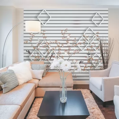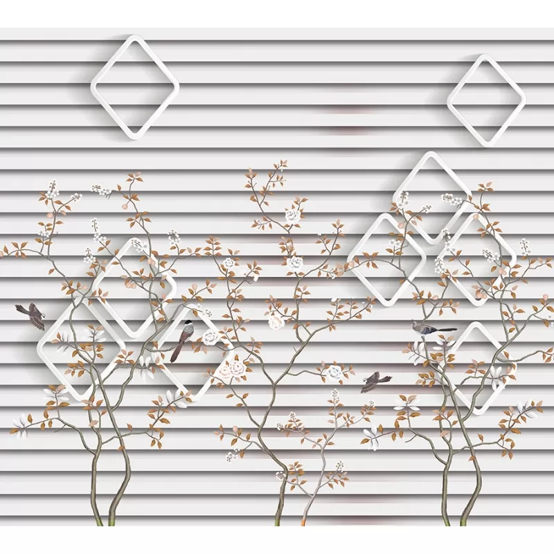 Теги: фотообои, Ситиарт, Сити арт, Cityart, City art, панно, белый, деревья, абстракция, птицы, полоски, розовый