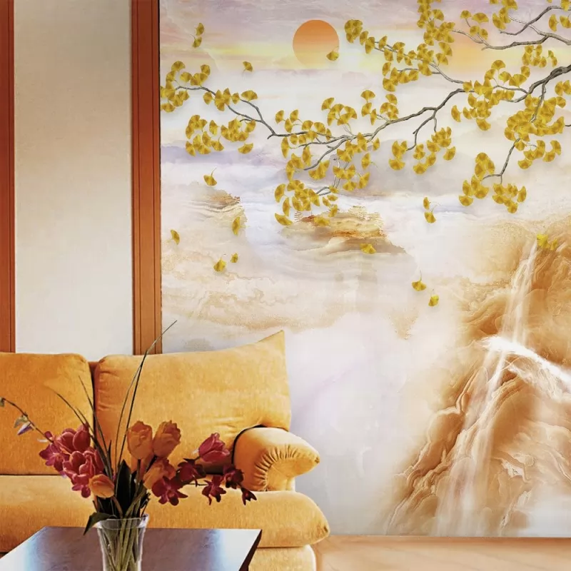 Теги: фотообои, Ситиарт, Сити арт, Cityart, City art, панно, оранжевый, ветер, листья, природа, дерево, закат, горы, туман, солнце