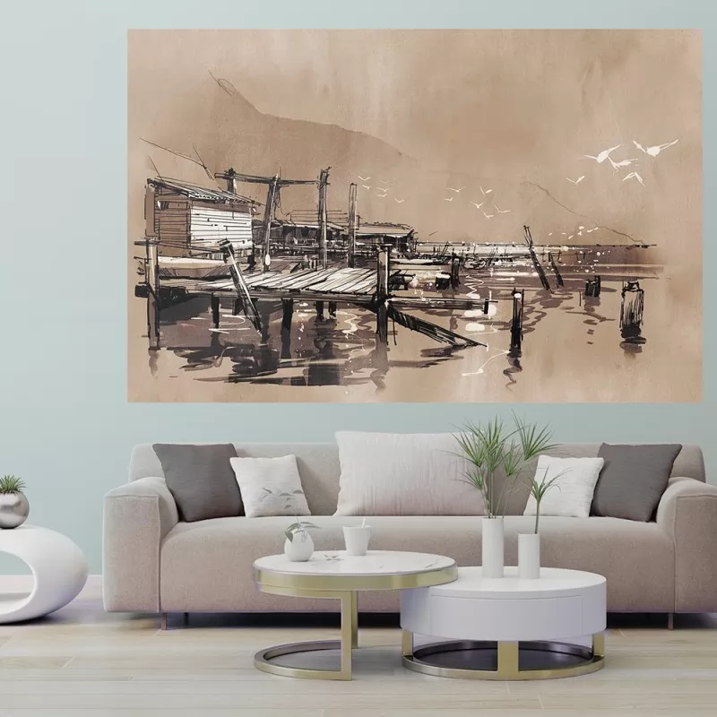 Теги: фотообои, Ситиарт, Сити арт, Cityart, City art, панно, горизонтальные, фактурные, рисунок, пейзаж, река, вода, мостки, чайки, причал
