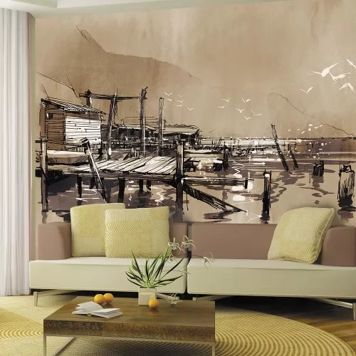 Теги: фотообои, Ситиарт, Сити арт, Cityart, City art, панно, горизонтальные, фактурные, рисунок, пейзаж, река, вода, мостки, чайки, причал
