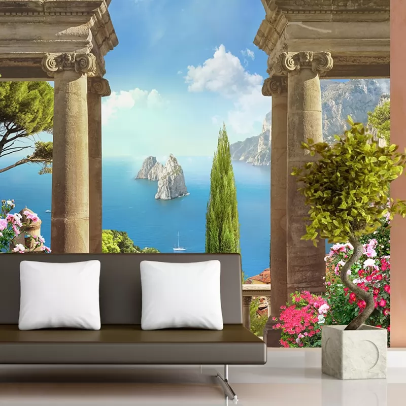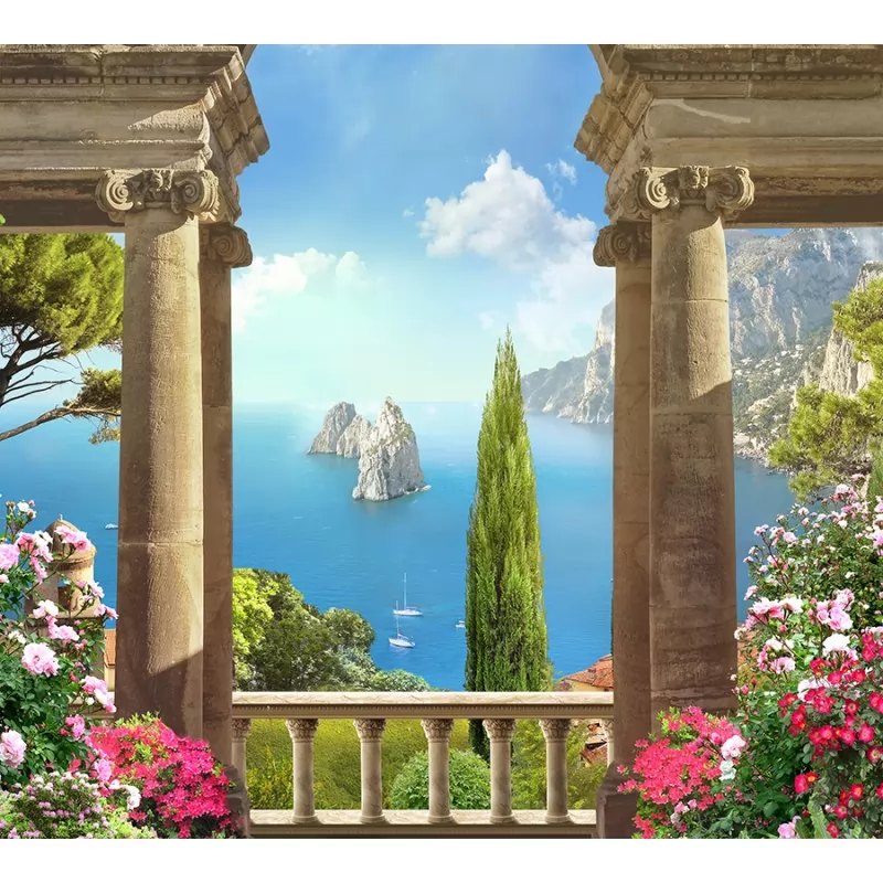 Теги: фотообои, Ситиарт, Сити арт, Cityart, City art, панно, фактурные, для кухни, для гостиной, для прихожей, для спальни, прибрежный городок, Италия, море, пейзаж, колонны, бухта, природа, горы, цветы