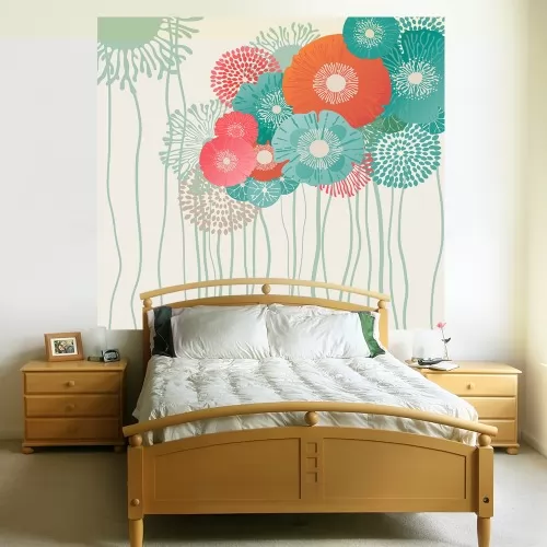 Теги: фотообои, милан, milan, для спальни, для гостиной, для кухни, для прихожей, для детской, цветы, абстракция, бирюзовый, светлый фон, оранжевый, коралловый, маки, одуванчики