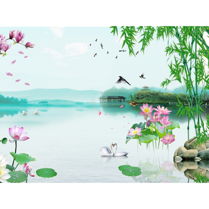 Теги: Лотос, бамбук, вода, птицы, лебеди, природа.