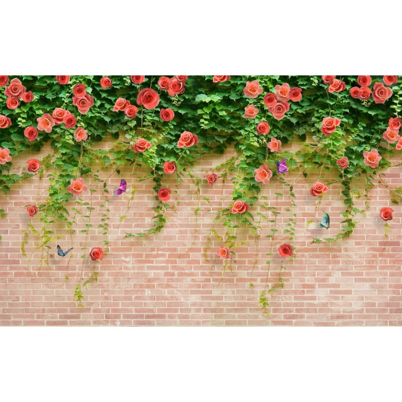Теги: стена, кирпич, бабочки, цветы, кусты, розы