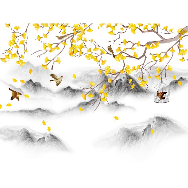 Теги: природа, горы, сакура, птицы, клетка, для спальни, для кабинета, 3d, для холла