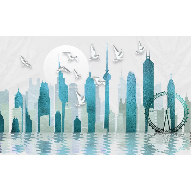 Теги: город, колесо обозрения, птицы, здания, море, стая, графика, для мальчика