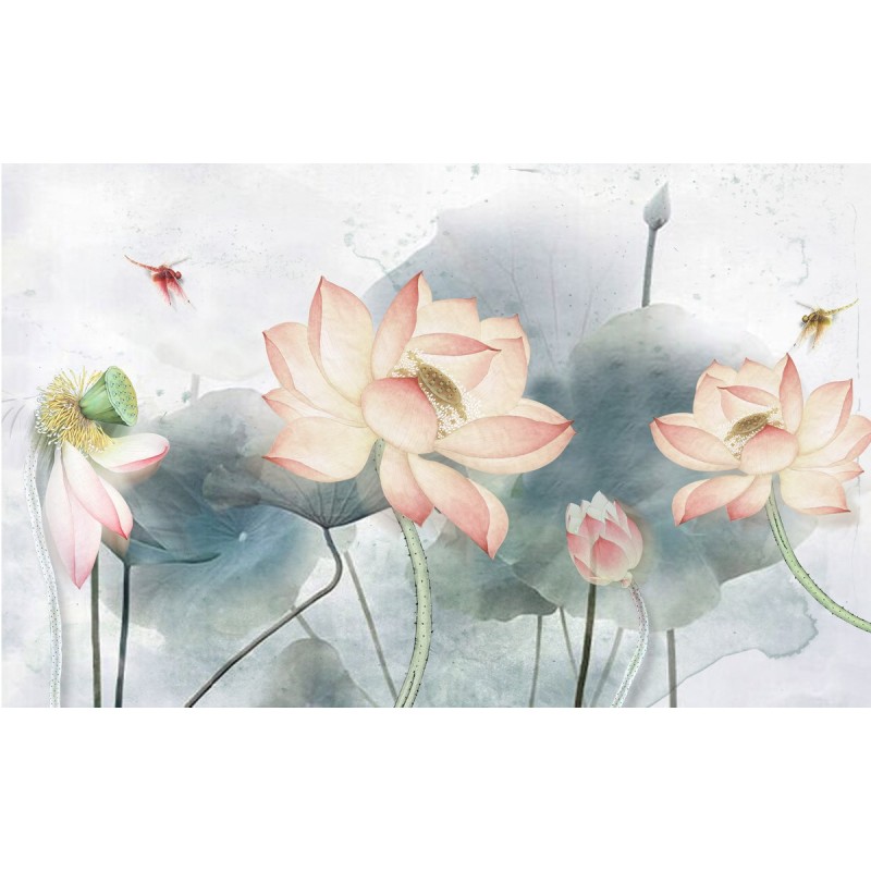 Теги: лотосы, цветы, стрекоза, бутоны, для холла, для ванной, для басейна