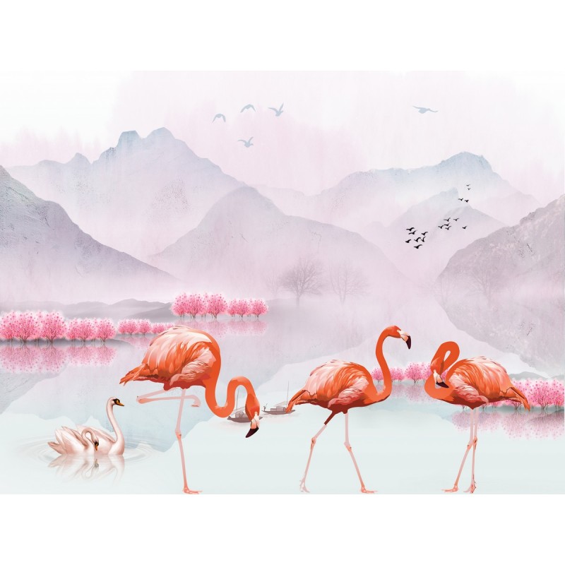 Теги: Птицы, фламинго, лебеди, горы, пейзаж, природа, для гостинной