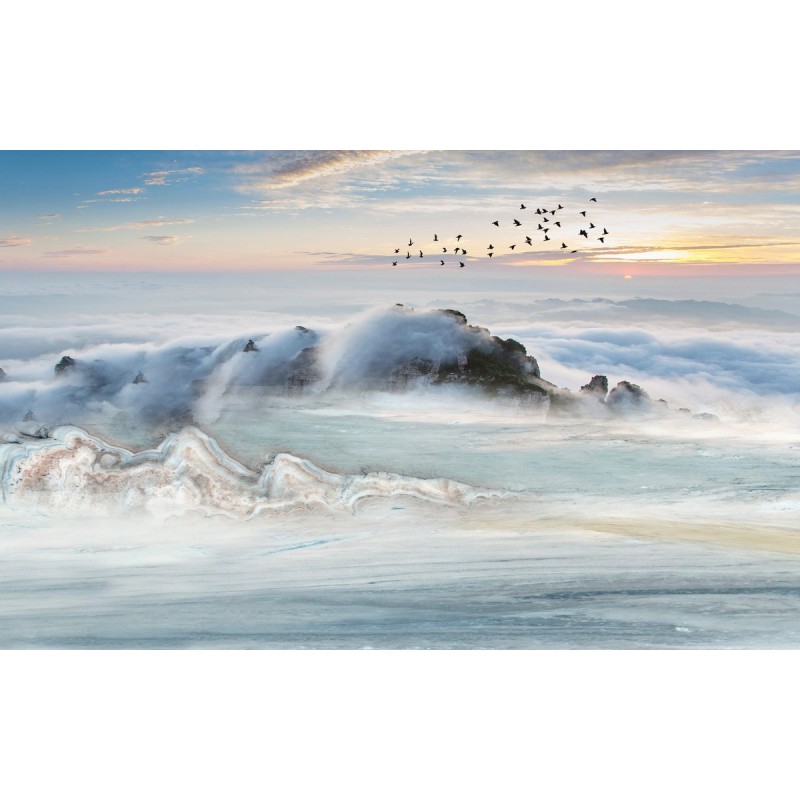 Теги: Рассвет, туман, горы, облака, птицы, полет.