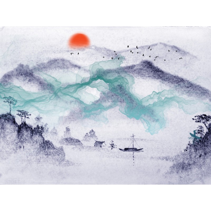 Теги: Закат, лодка, море, деревья, птицы, горы